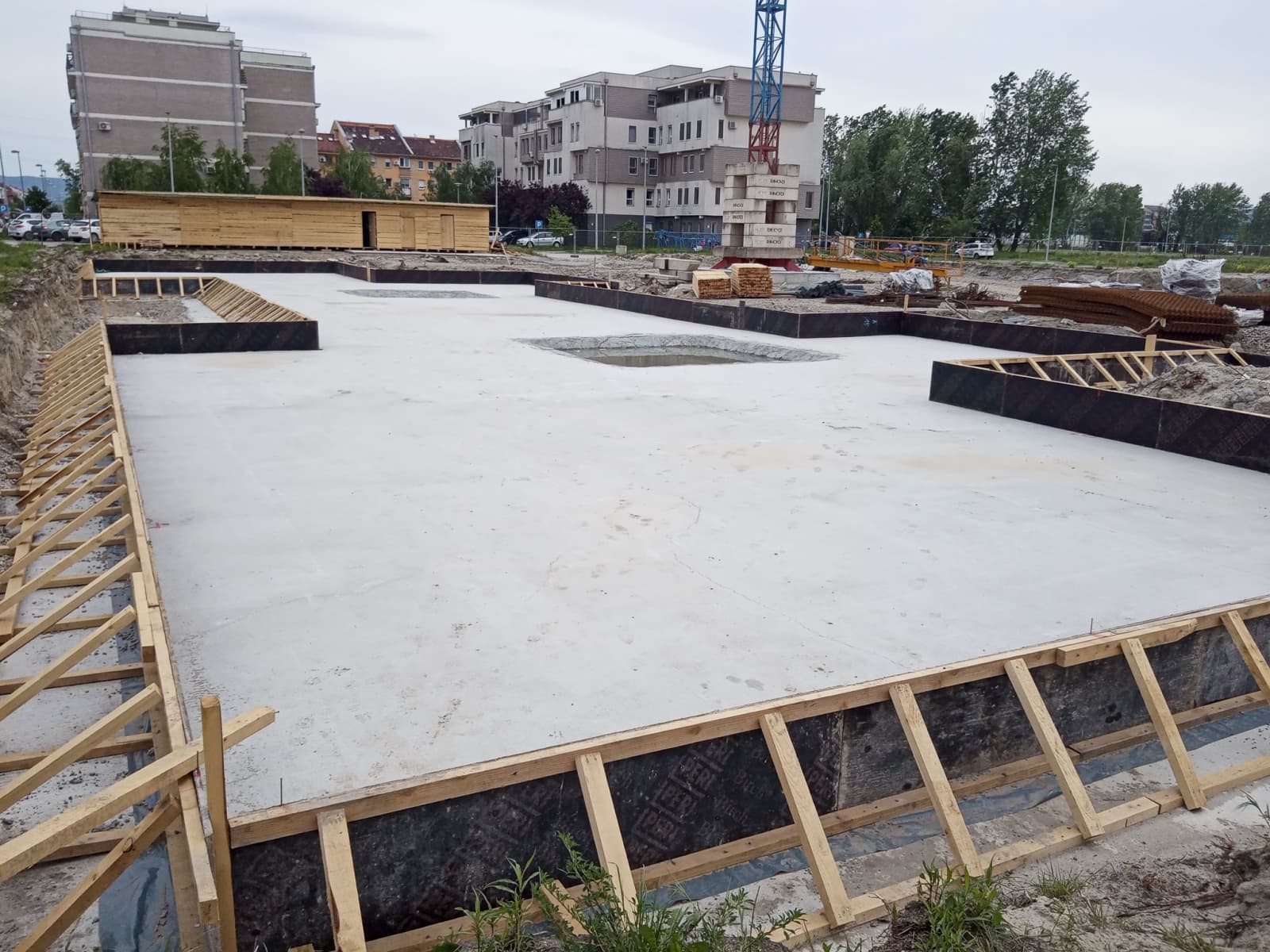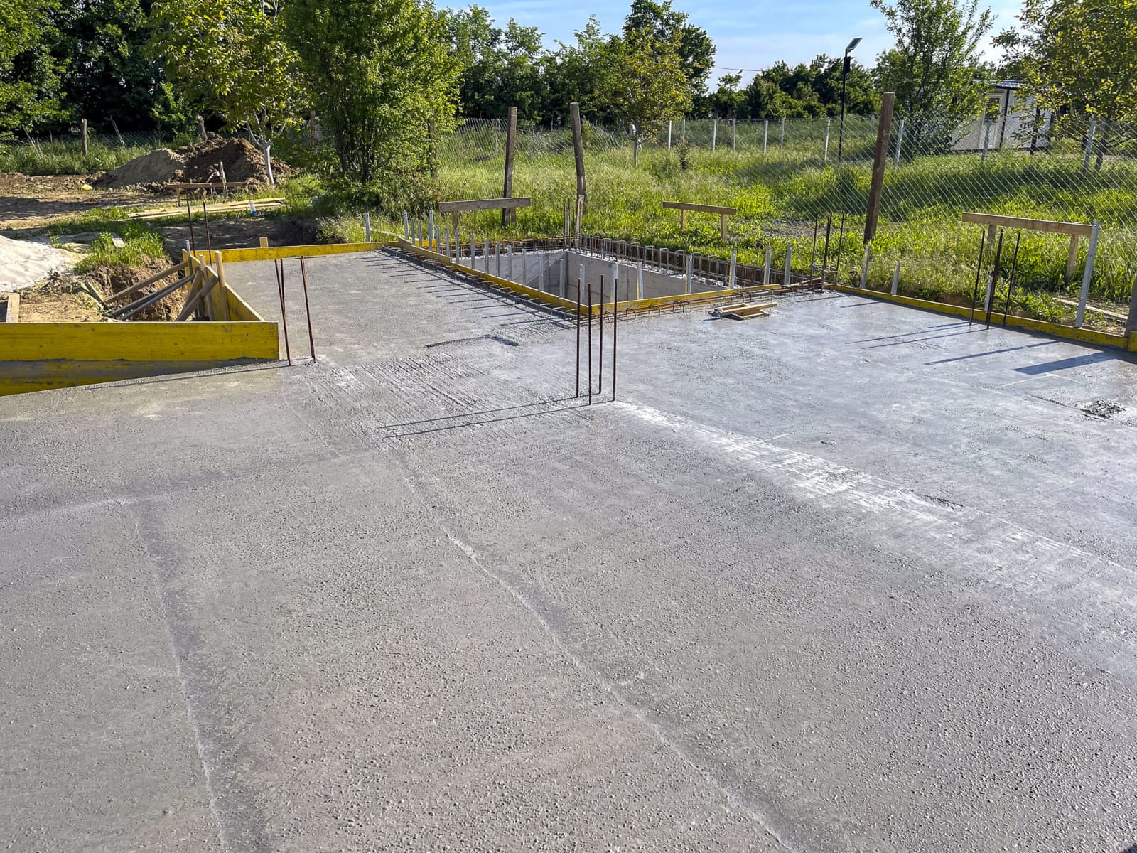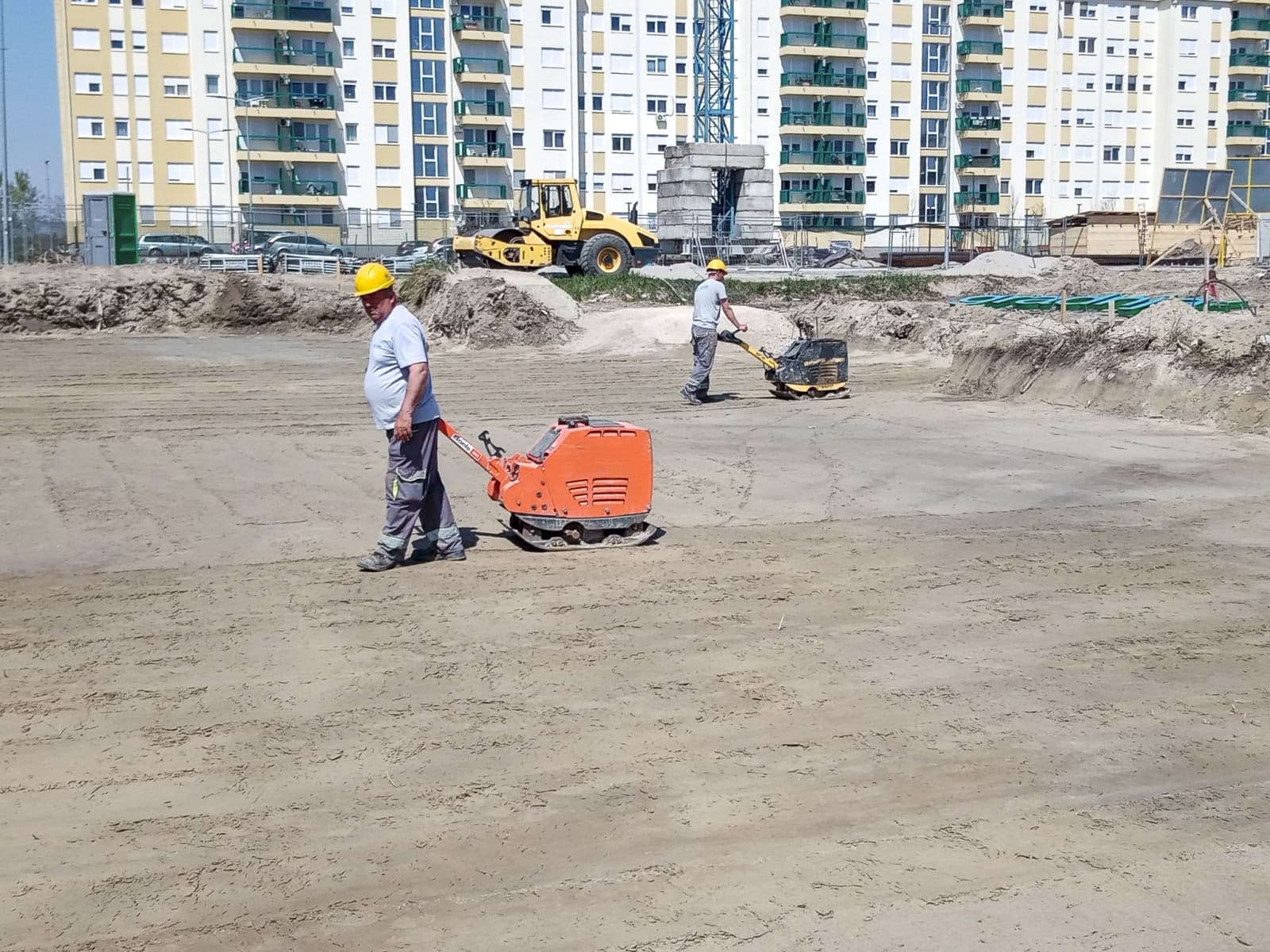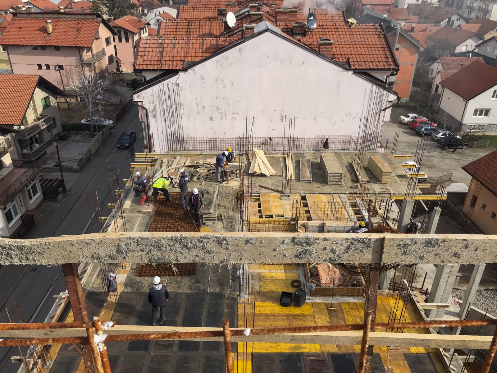 Pregled faza izgradnje objekta kroz fotografije koji prikazuju organizaciju, napredak i tok radova na terenu — od pripreme podloge do završnih radova.